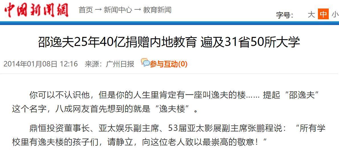 1.邵逸夫25年40亿捐赠内地教育 遍及31省50所大学——2014年01月08日 12:16 来源:广州日报
