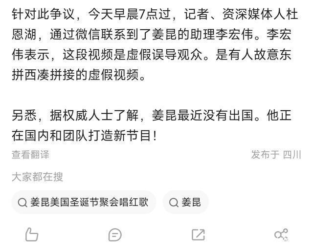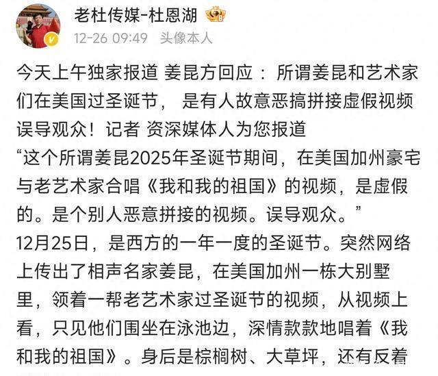 可就在大家等着“锤”落地时,剧情来了个大反转。 12日,资深记者杜恩湖一发声,直接打破所有猜测: 视频是假的,是有人东拼西凑恶意剪辑,姜昆本人根本没出国! 1、真相揭晓:一段视频,差点毁了一个人的一生 知名媒体人杜恩湖第一个站出来说话了。