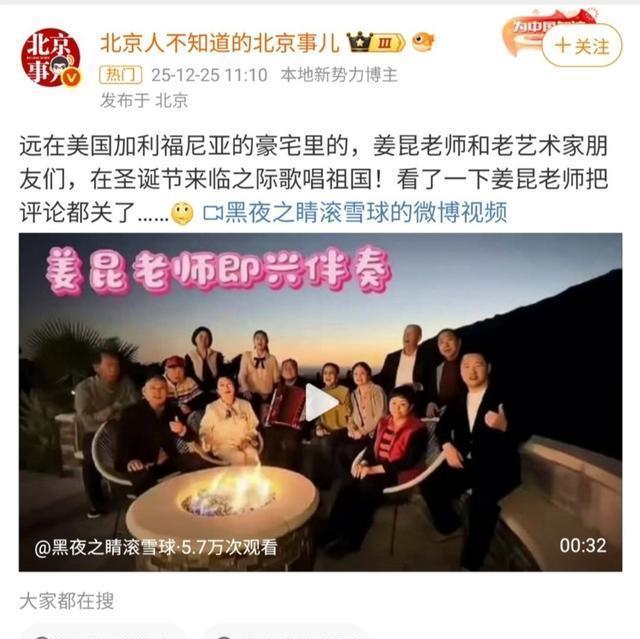 “这不是姜昆吗?手风琴拉得倍儿溜!” “合着圣诞节去了国外,还带老艺术家们唱红歌?” 这几天,互联网上的热搜榜被一段视频占了个满满当当——一群老艺术家围坐在泳池边,棕榈树、红酒、手风琴,还有熟悉的旋律《我和我的祖国》。C位的那位——怎么看怎么像姜昆。